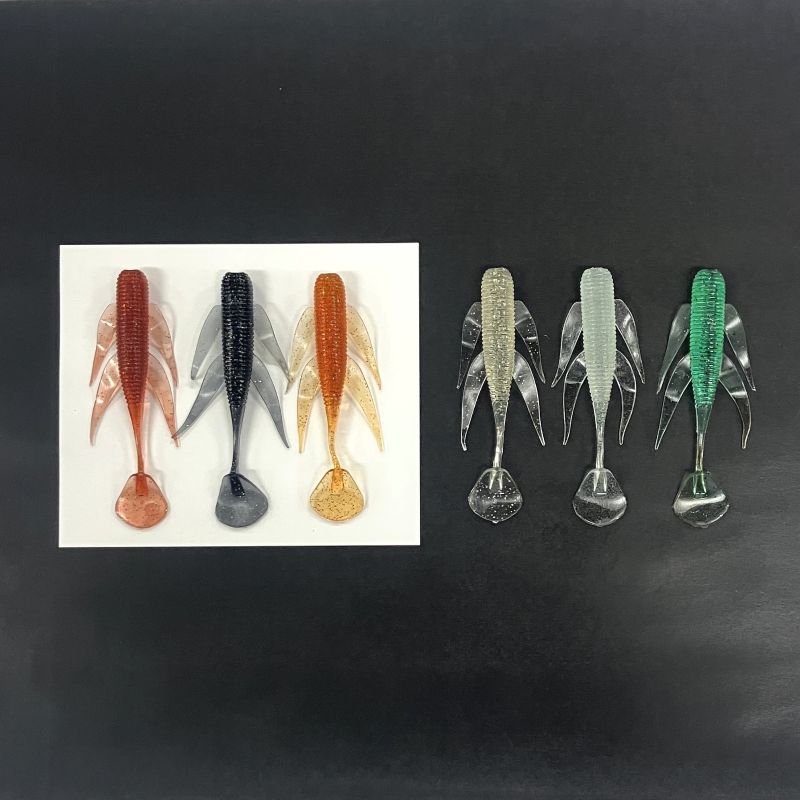 揺らぎで誘う!名古屋港特化型のワームです!対象魚 は メバル・キジハタ・クロダイ などなど アピール抜群のビッグテールを採用して、テールの水受けの反動でボディが左右に揺らぎ、警戒心の無いベイトを演出していますシェイク時にサイドの羽根がバイトを誘います